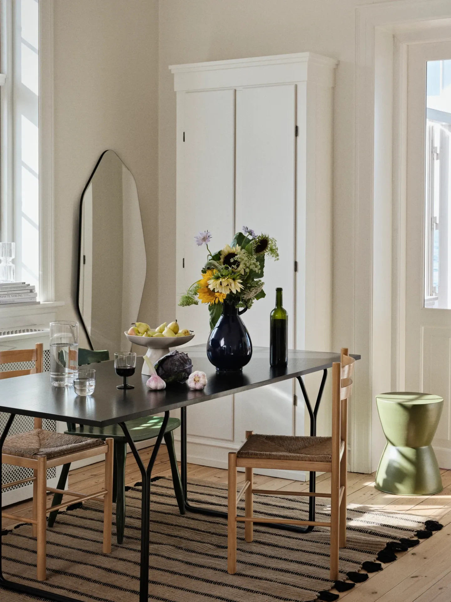 Stilig Berit spisebord fra Broste Copenhagen som pryder både spisestuen og kjøkkenet. Bordplaten er laget av svartlakkert asketrefiner, og de flotte bordbena er laget av svart pulverlakkert stål.
