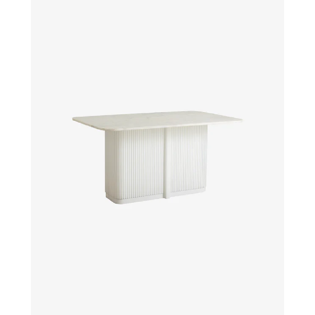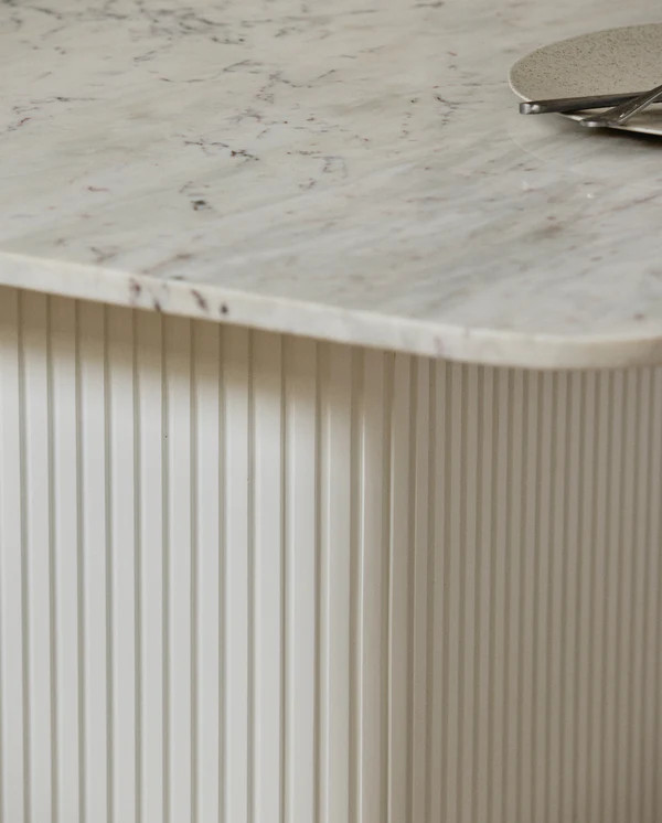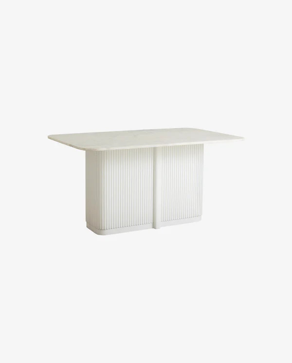 Bordplaten i lys naturlig marmor gir en rolig og eksklusiv følelse, mens den skulpturelle basen i mangotre og MDF tilfører mykt volum og et jordnært uttrykk. Bordplaten av marmor er 2 cm tykk.