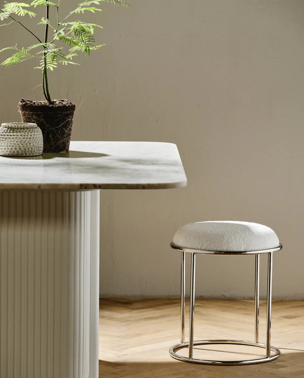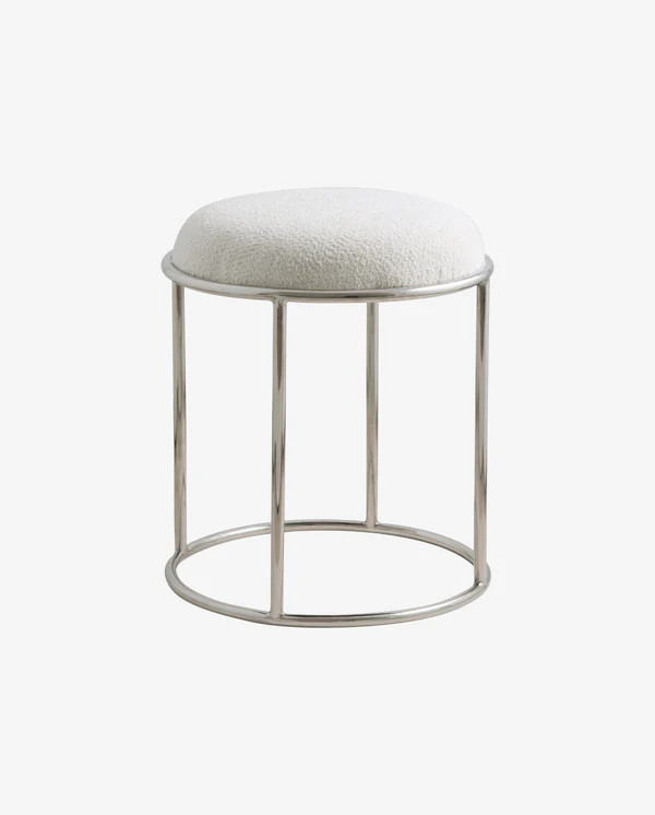 Komati er en elegant krakk med et moderne og luftig design. Det runde og mykt polstrede setet står i vakker kontrast til den slanke stålrammen, og skaper en harmonisk balanse mellom komfort og letthet. Elfenbensfargen gir et mykt og sofistikert preg, noe som gjør den perfekt for soverom, stue eller ganger.