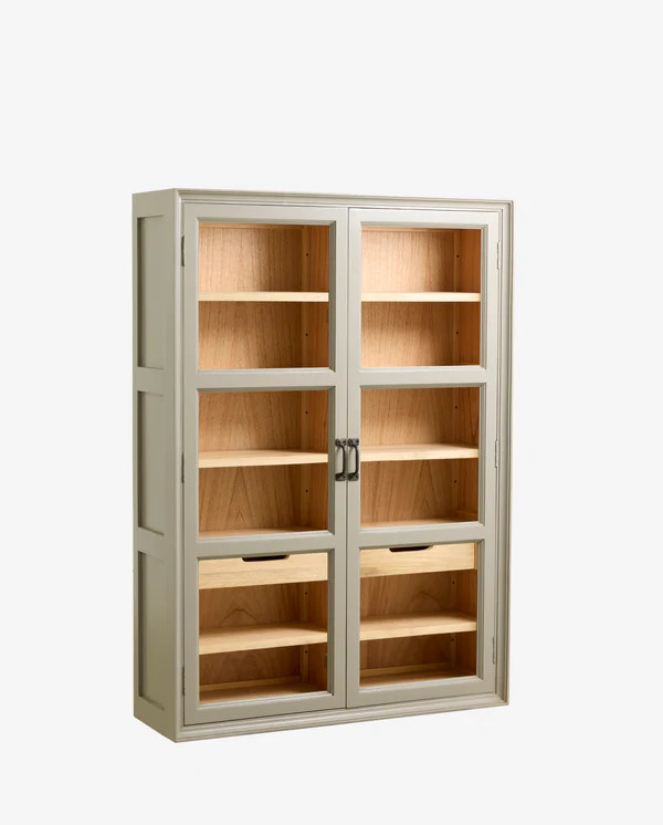Det flotte VIVA-veggskapet blander funksjonalitet og eleganse i et tidløst design som passer inn i mange rom. Med en gråmalt gmelina-treramme og to glassdører skaper det en raffinert utstilling for favorittgjenstandene dine – enten det er keramikk, glass, krydder eller små dekorative gjenstander.